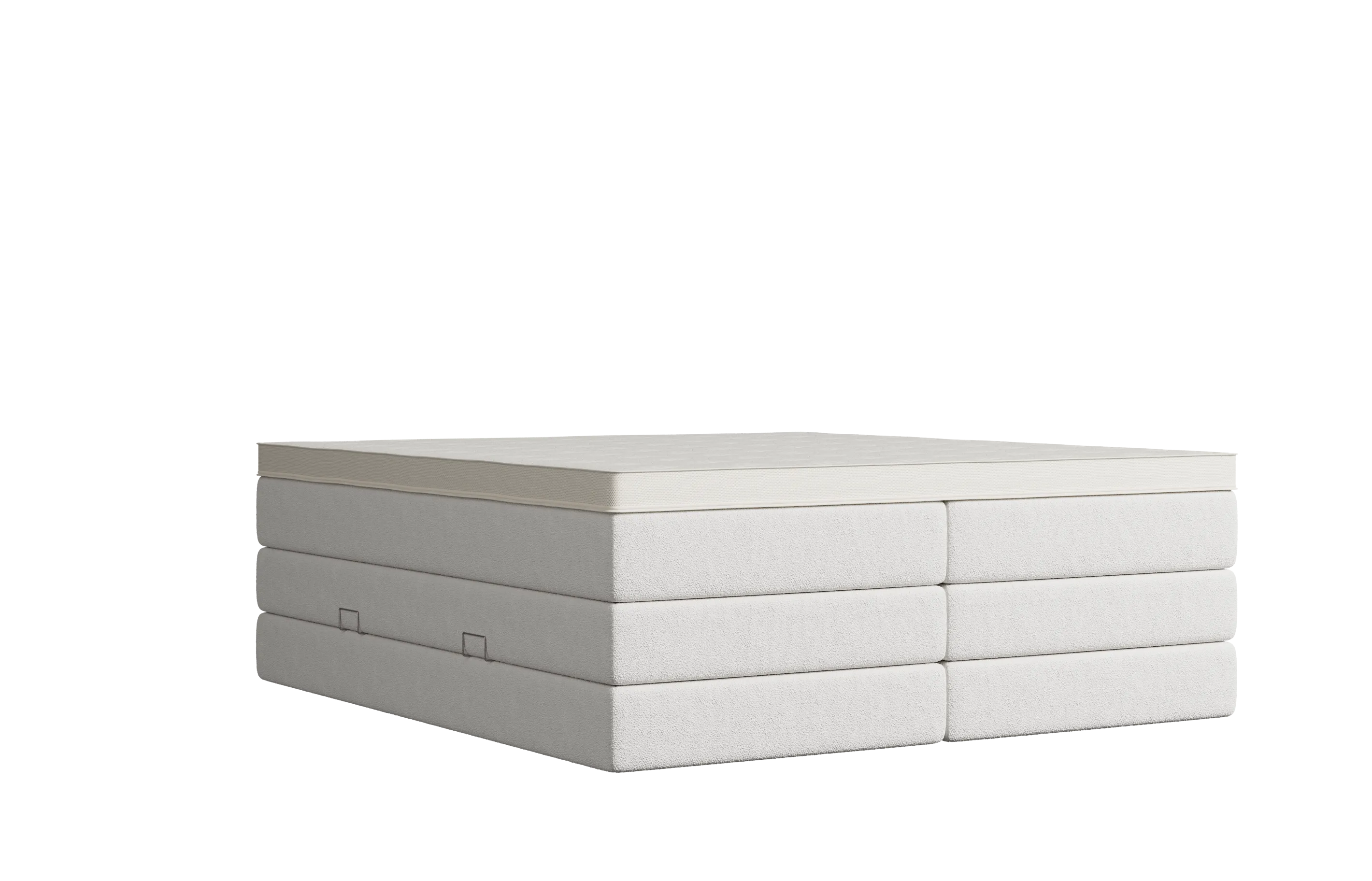 Selber Komfort, anderes Design: Das Bett erhältst du optional mit einem Topper, der in die Matratze integriert ist. Schäume und Federkerne sind identisch wie bei der Variante mit aufliegendem Topper. Optisch ist die Matratze nicht mit Textil, sondern mit einem weißen Doppeltuch bezogen.