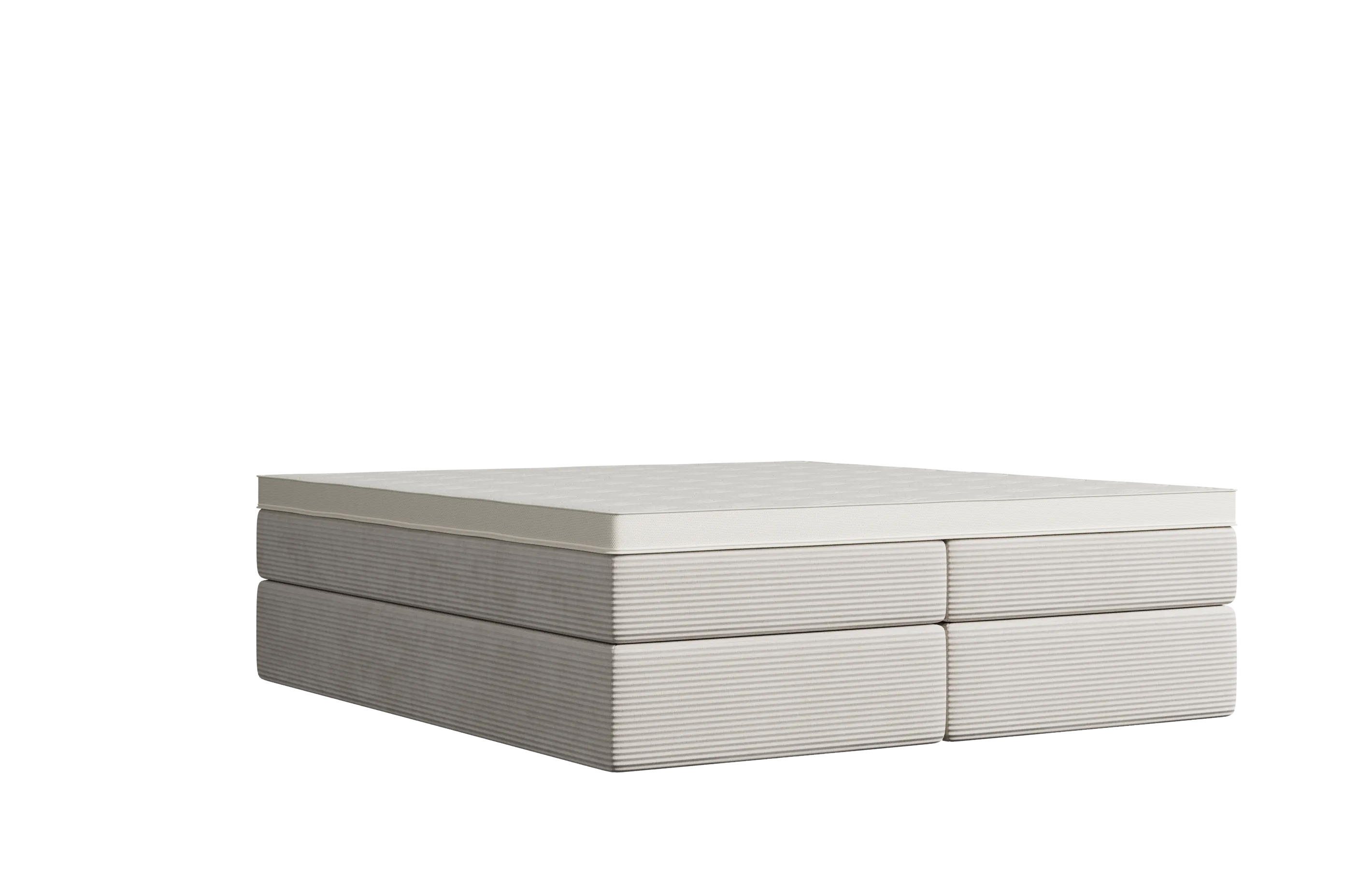 Selber Komfort, anderes Design: Das Bett erhältst du optional mit einem Topper, der in die Matratze integriert ist. Schäume und Federkerne sind identisch wie bei der Variante mit aufliegendem Topper. Optisch ist die Matratze nicht mit Textil, sondern mit einem weißen Doppeltuch bezogen.