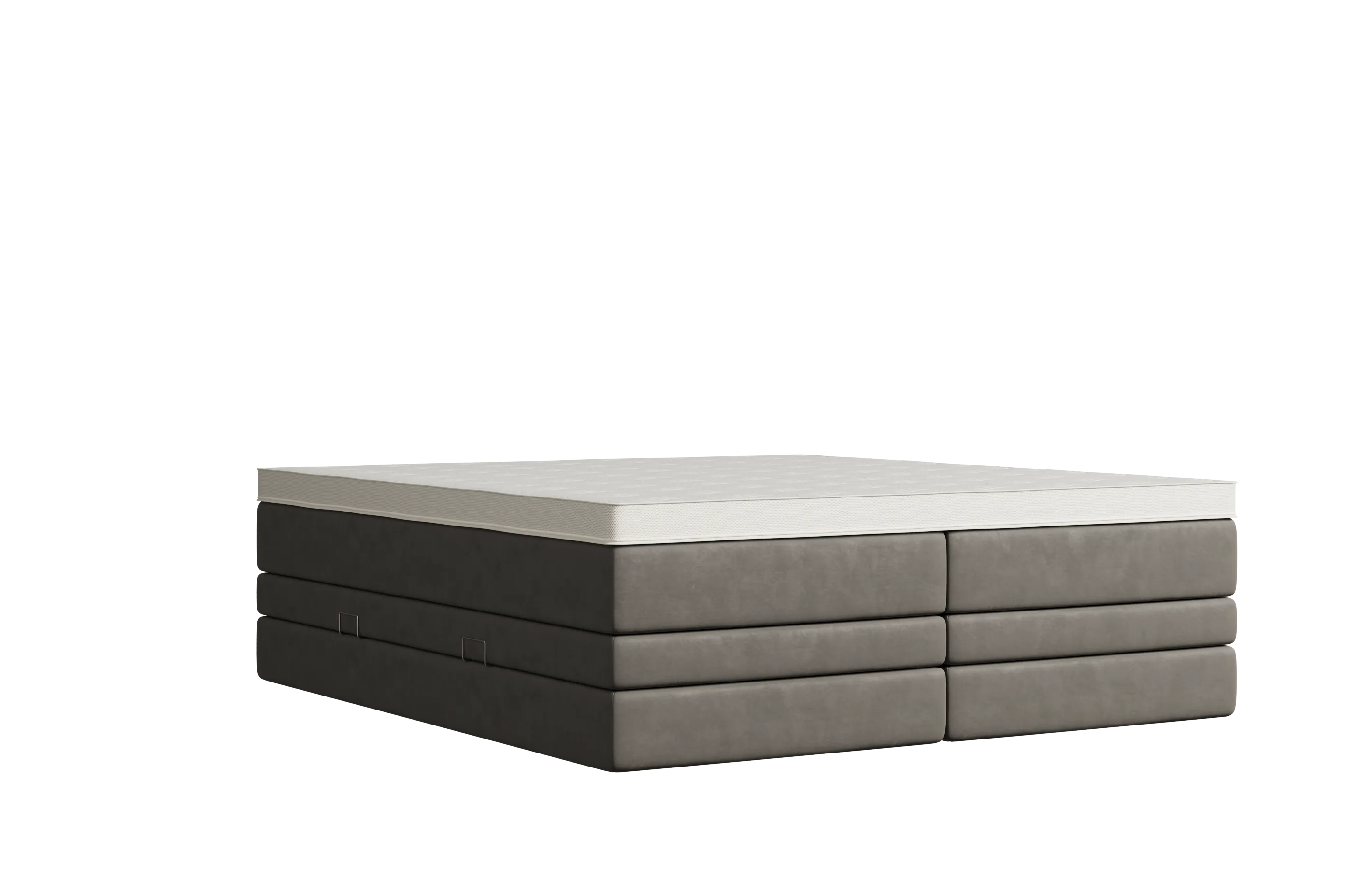 Selber Komfort, anderes Design: Das Bett erhältst du optional mit einem Topper, der in die Matratze integriert ist. Schäume und Federkerne sind identisch wie bei der Variante mit aufliegendem Topper. Optisch ist die Matratze nicht mit Textil, sondern mit einem weißen Doppeltuch bezogen.